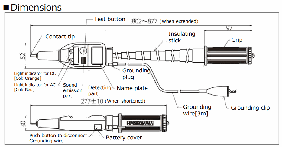 - With grounding wire attached: AC: 100V - 7kV, DC: 50V – 7kV (21 kV DC dielectric strength test for fully extended device)