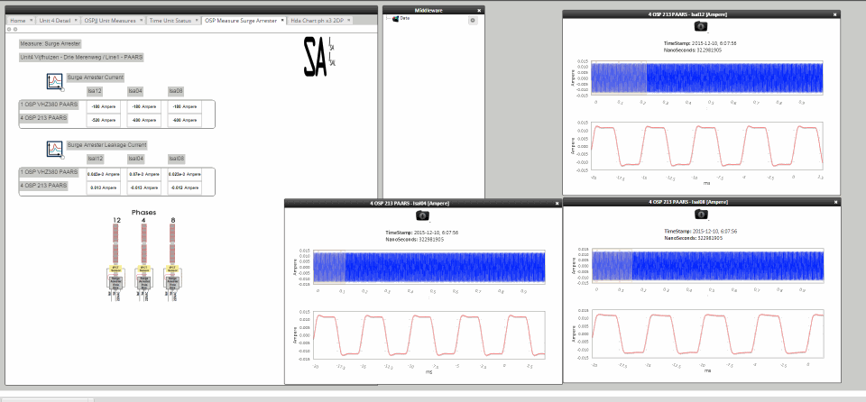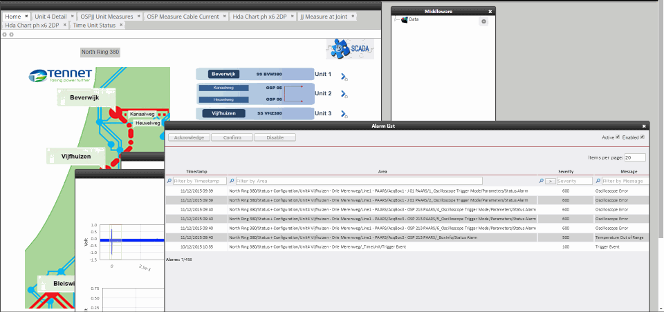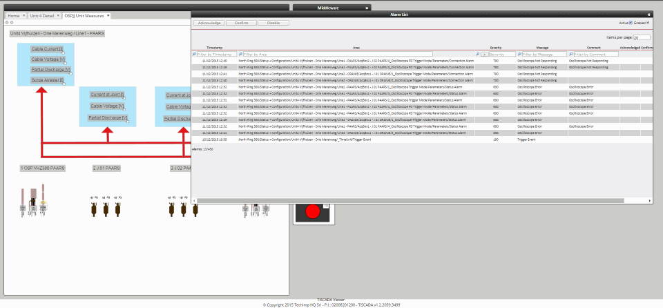 The PCMONS is installed over a 40 km high-voltage power network in the north of the Netherlands, distributed in eight units covering 13 locations and four substations. It is composed of sensors connected to cabinets hosting amplifiers, acquisition instruments from Pico Technology and the triggering logic. The cabinets are connected via fiber optic to one server for each unit, where the triggering signals are distributed and the data is collected and transmitted to the central unit. This is the central server where data is stored for visualization and analysis using the proprietary human/machine interface (HMI) software, Techimp TiSCADA.