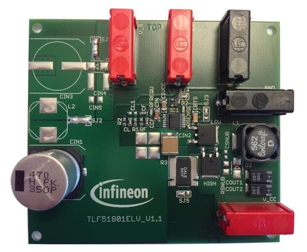 Infineon DEMOBOARDTLF51801ELTOBO1 Voltage Regulator - Switching Regulator This application board shall enable You to test the performance oft the TLF51801ELV 10 A synchronous Step-Down Controller, adjustable Vout The board is equipped with a TLF51801ELV, it is preset to 5V output and 5 Amps. The board offers the possibilit