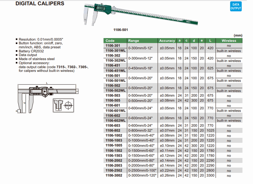 INSIZE 1106-501WL Digital Caliper (0-500mm/0-20"; 0.01mm/0.0005"; ±0.05mm) | EMIN.CO.TH