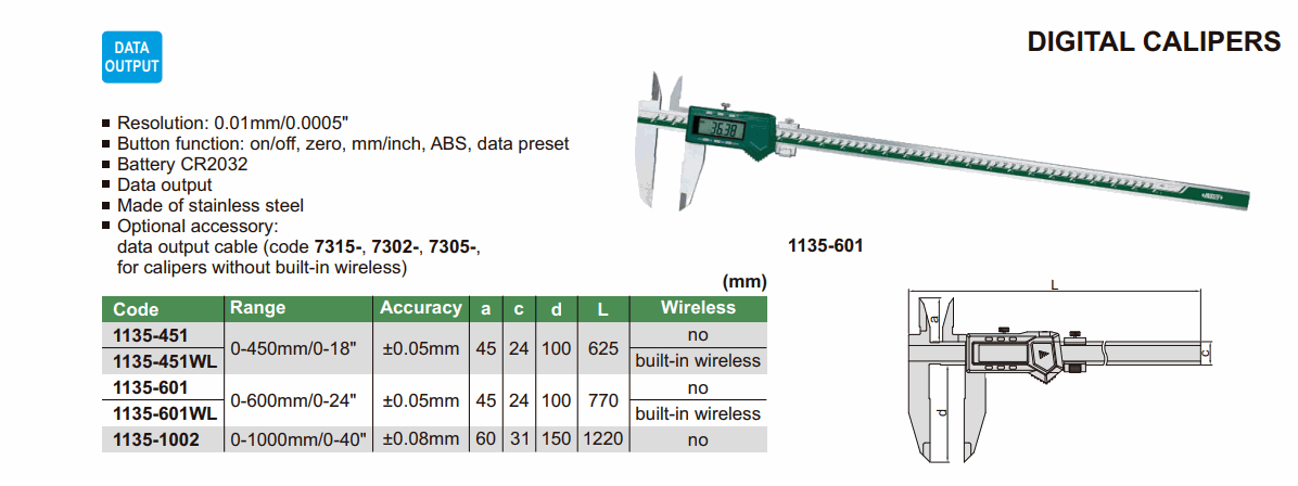 INSIZE 1135-451WL Digital Caliper (0-450mm/0-18"; 0.01mm/0.0005"; ±0.05mm) | EMIN.CO.TH