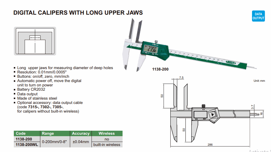 INSIZE 1138-200 Digital Caliper With Long Upper Jaws (0-200mm/0-8”; 0.01mm/0.0005”; No built-in wireless) | EMIN.CO.TH