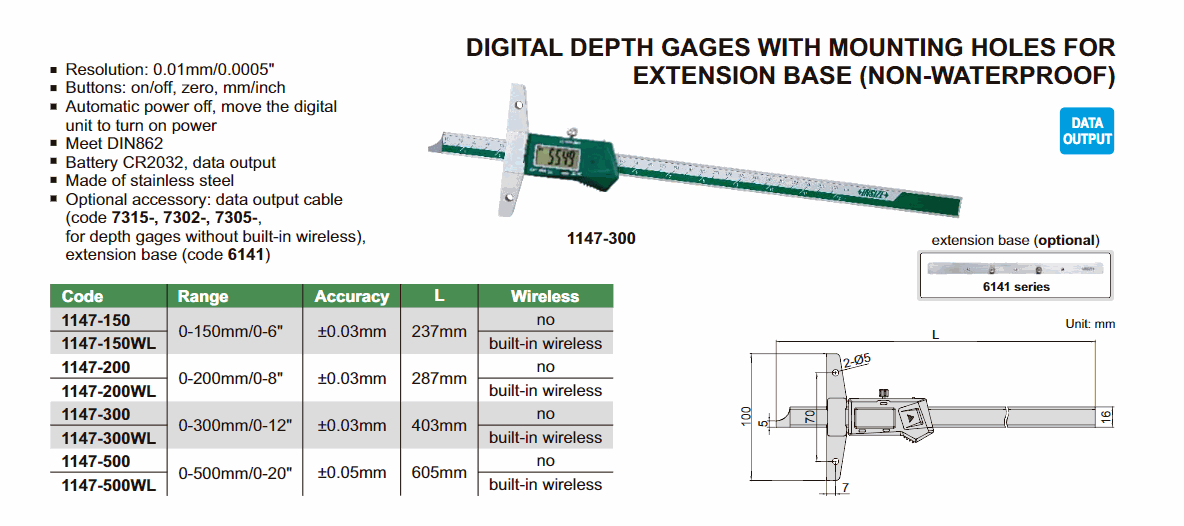 INSIZE 1147-200WL Digital Depth Gage With Mounting Hole For Extension Base (0~200mm; Built-in wireless) | EMIN.CO.TH