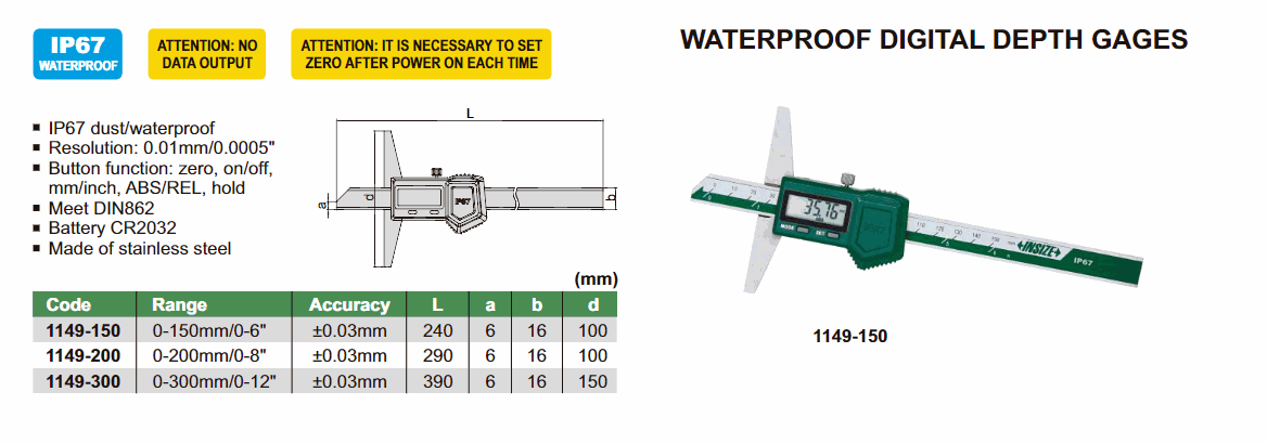 INSIZE 1149-200 Waterproof Digital Depth Gage (0~200mm) | EMIN.CO.TH