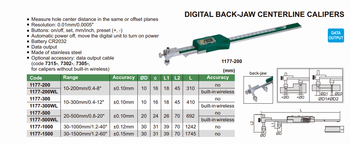 INSIZE 1177-300WL Digital Back-Jaw Centerline Caliper (10-300mm/0.4-12"; 0.01mm/0.0005") | EMIN.CO.TH