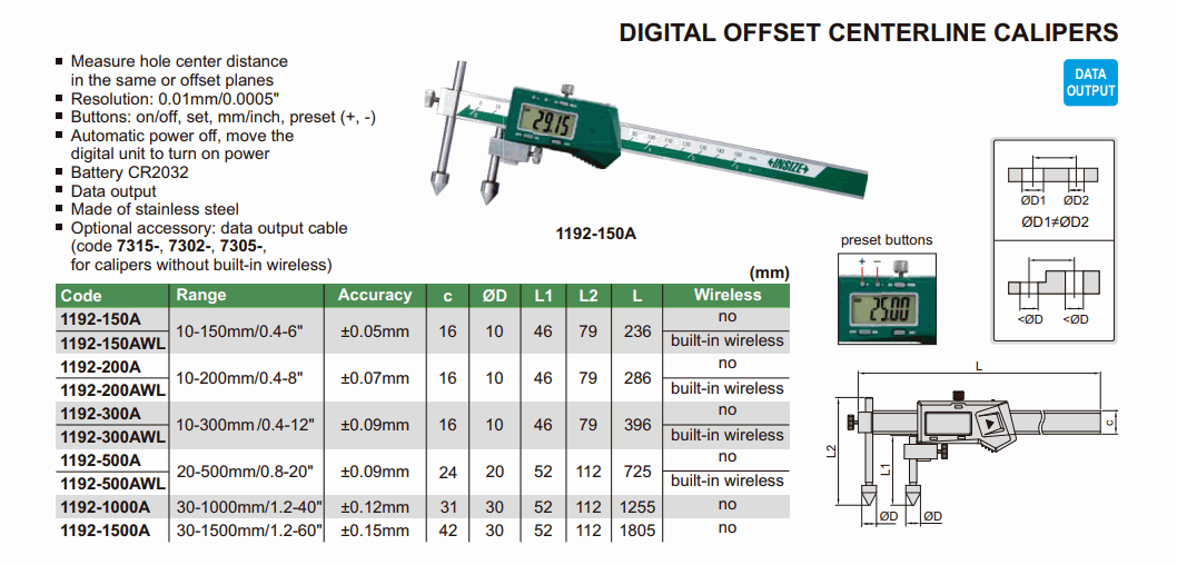INSIZE 1192-500AWL Digital Offset Centerline Caliper (20-500mm/0.8-20"; 0.01mm/0.0005"; ±0.09mm) | EMIN.CO.TH
