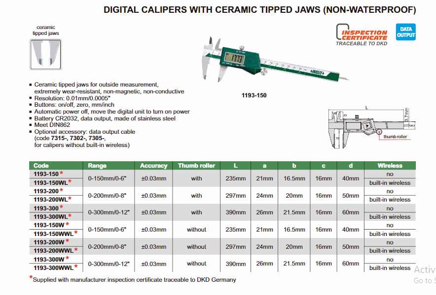 INSIZE 1193-300WL Digital Caliper With Ceramic Tipped Jaws (0~300mm; With thumb roller) | EMIN.CO.TH