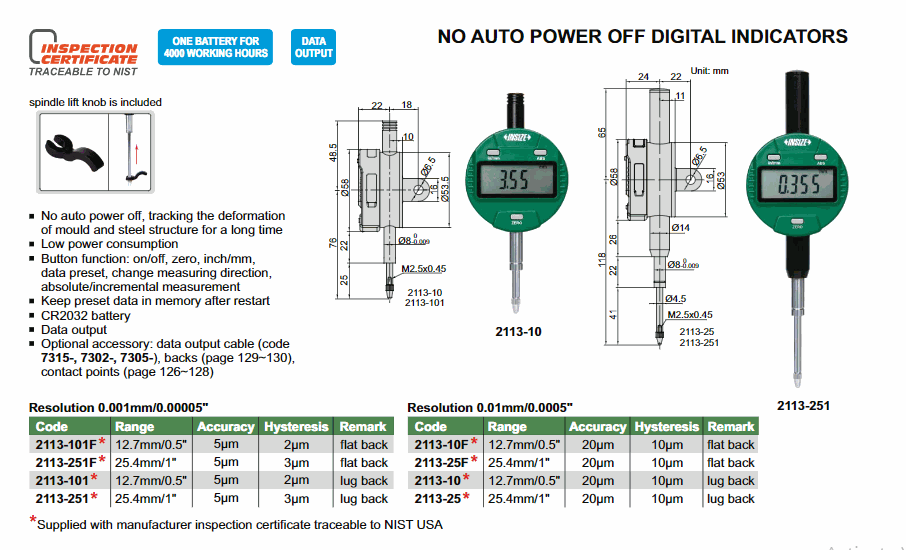 INSIZE 2113-101F No Auto Power Off Digital Indicator (12.7mm/0.5"; 0.001mm/0.00005") | EMIN.CO.TH