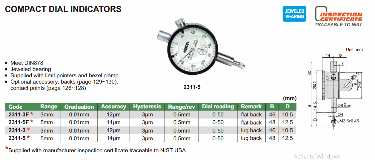 INSIZE 2311-5F Compact Dial Indicator (5mm; flat back) | EMIN.CO.TH