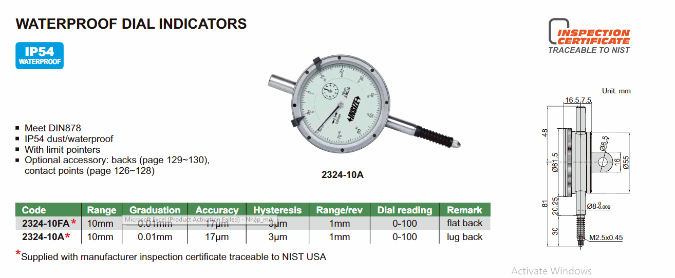 INSIZE 2324-10A Waterproof Dial Indicator (10mm; 0.01mm) | EMIN.CO.TH