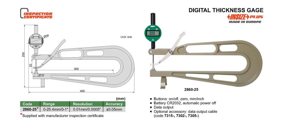 INSIZE 2860-25 Digital Thickness Gage (0-25.4mm/0-1", ±0.05mm, 0.01mm/0.0005") | EMIN.CO.TH