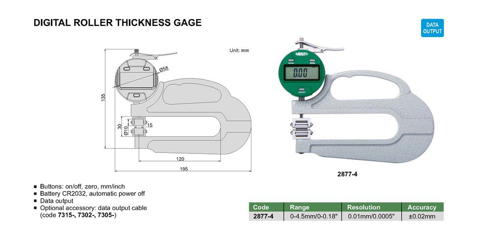 INSIZE 2877-4 Digital Roller Thickness Gage (0-4.5mm/0-0.18", ±0.02mm, 0.01mm/0.0005") | EMIN.CO.TH