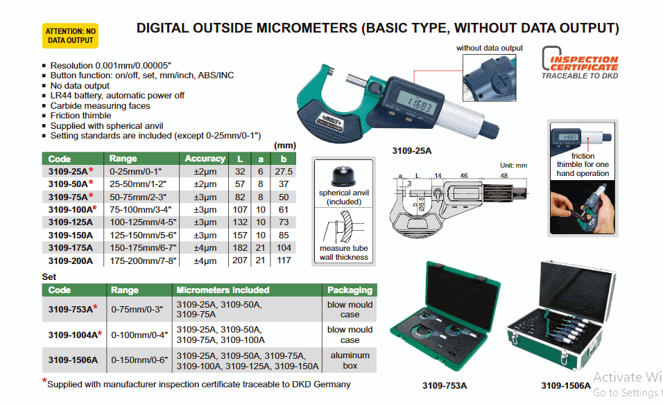 INSIZE 3109-1506A Digital Outside Micrometer Set (0-150mm/0-6"; Basic type; Without data output) | EMIN.CO.TH