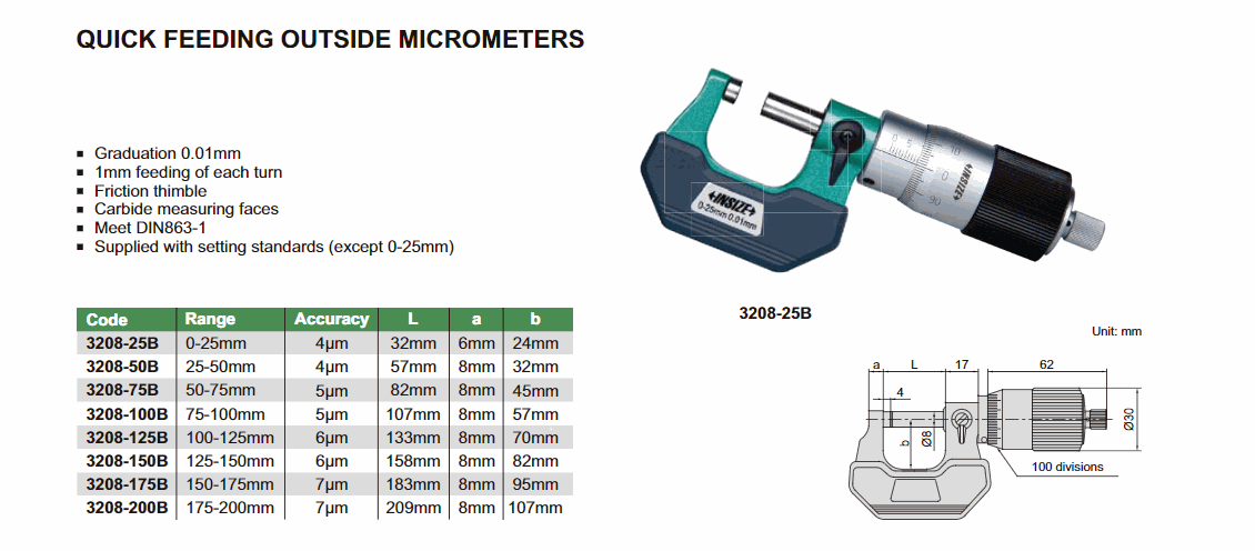 INSIZE 3208-100B Quick Feeding Outside Micrometer (75-100mm; 0.01mm) | EMIN.CO.TH