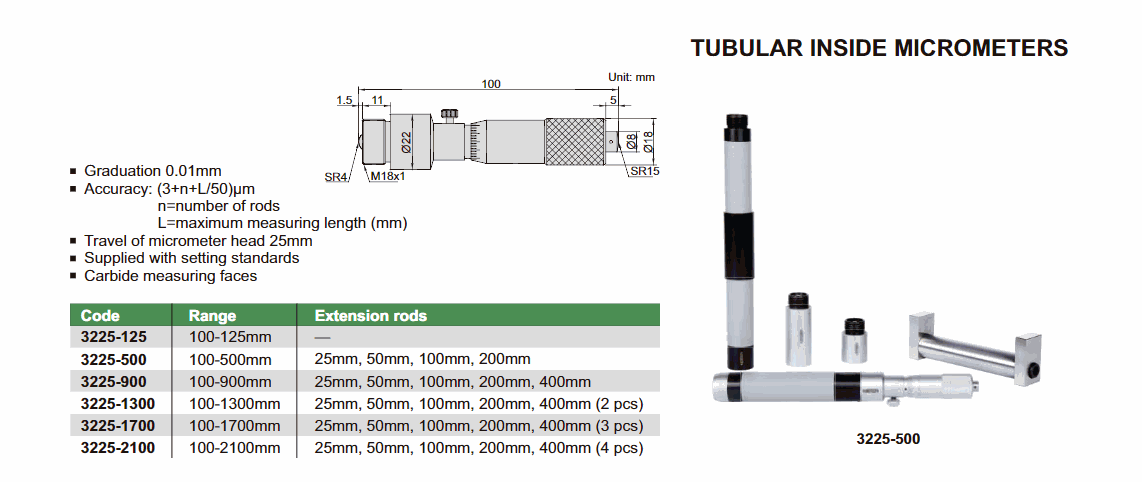 INSIZE 3225-125 Tubular Inside Micrometer (100-125mm; 0.01mm) | EMIN.CO.TH