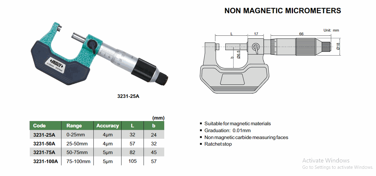 INSIZE 3231-100A Non Magnetic Micrometer (75-100mm; 0.01mm; 5µm) | EMIN.CO.TH