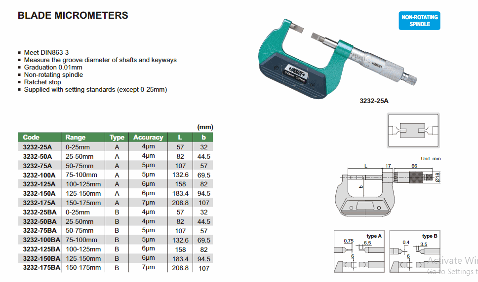 INSIZE 3232-25BA Blade Micrometer (0-25mm; 0.01mm; 4µm) | EMIN.CO.TH