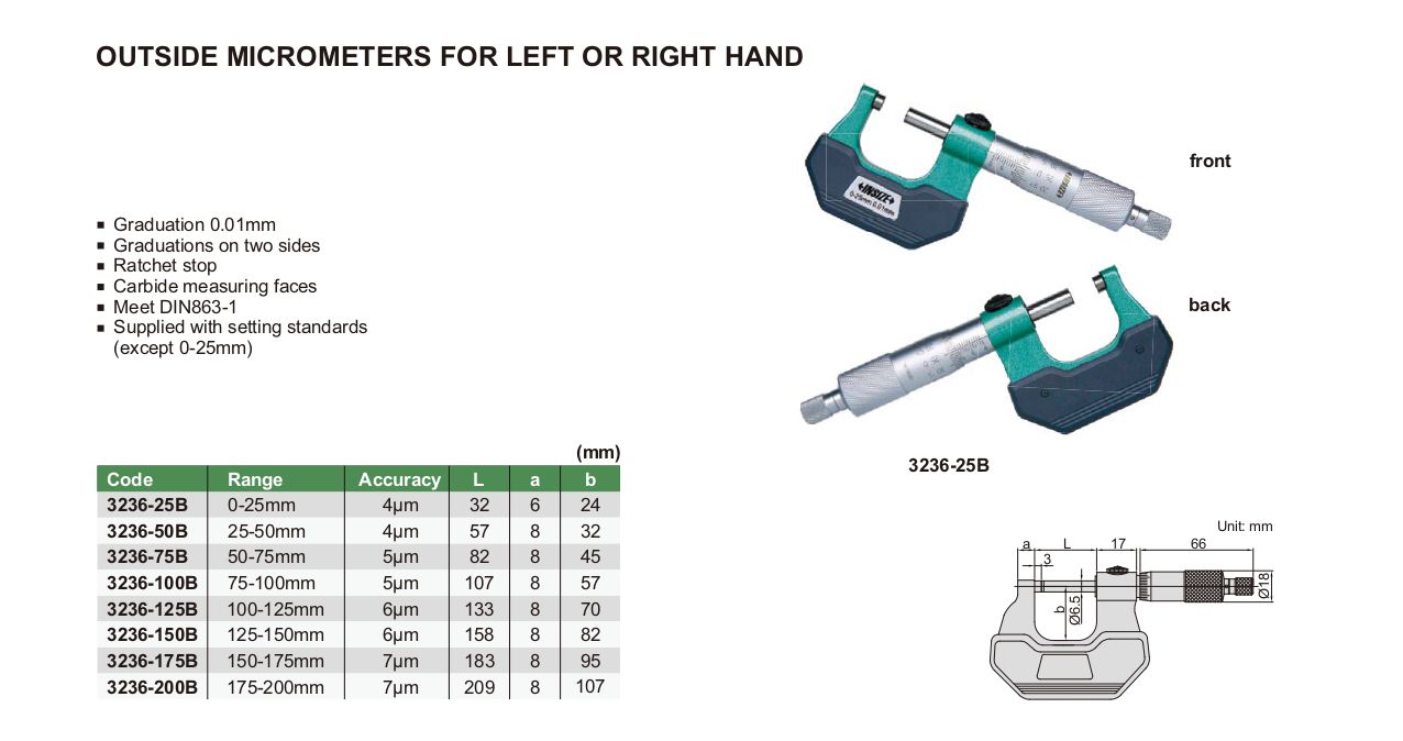 INSIZE 3236-100B Outside Micrometer For Left And Right Hand (75-100mm) | EMIN.CO.TH