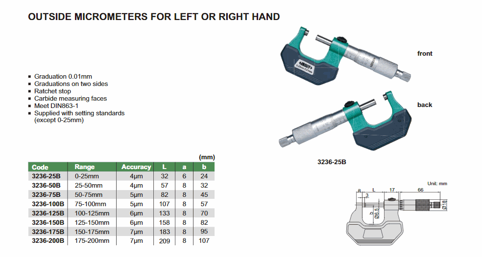 INSIZE 3236-50B Outside Micrometer For Left And Right Hand (25-50mm; 0.01mm; 4µm) | EMIN.CO.TH
