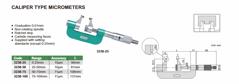 INSIZE 3238-25 Caliper Type Micrometer (0-25mm; 0.01mm; 10µm) | EMIN.CO.TH