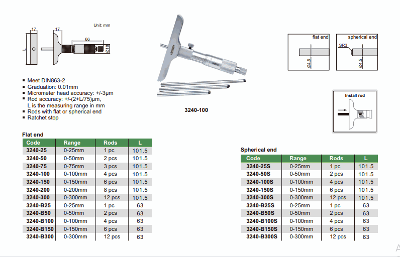 INSIZE 3240-B50S Depth Micrometer (0-50mm; 0.01mm; Spherical end) | EMIN.CO.TH