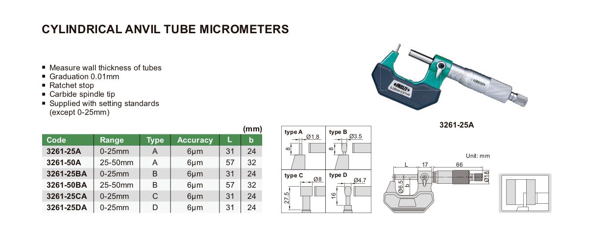 INSIZE 3261-50BA Cylindrical Anvil Tube Micrometer (25-50mm) | EMIN.CO.TH