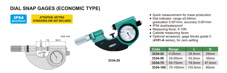 INSIZE 3334-25 Dial Snap Gage (0-25mm; 0.001mm; 0.001mm) | EMIN.CO.TH