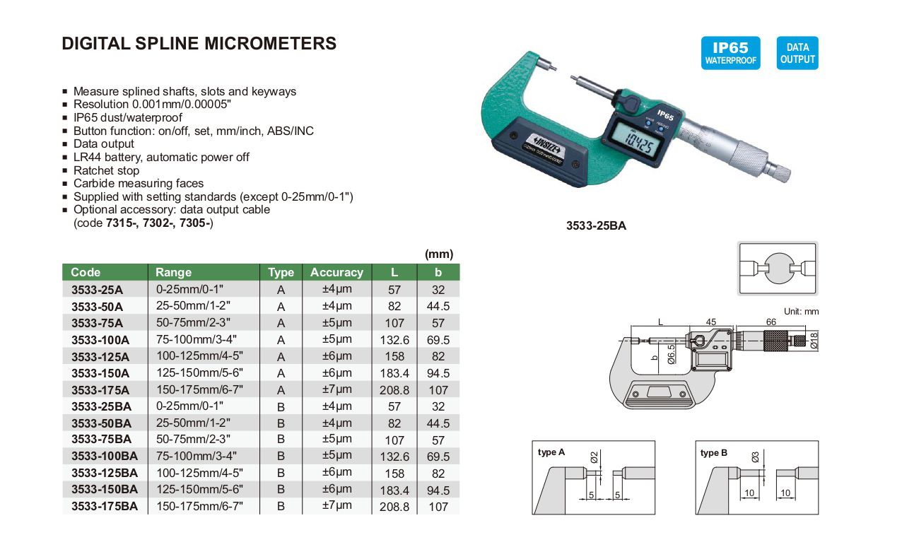 INSIZE 3533-75BA Digital Spline Micrometer (50-75mm/2-3"/Type B) | EMIN.CO.TH