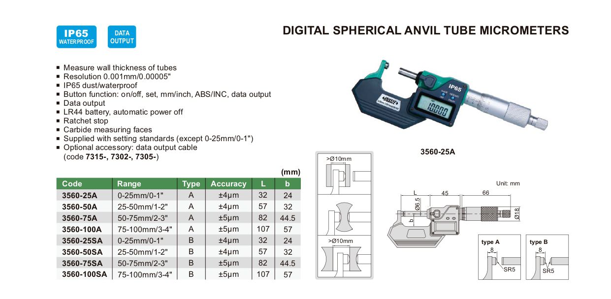 INSIZE 3560-25A Digital Spherical Anvil Tube Micrometer (0-25mm/0-1") | EMIN.CO.TH