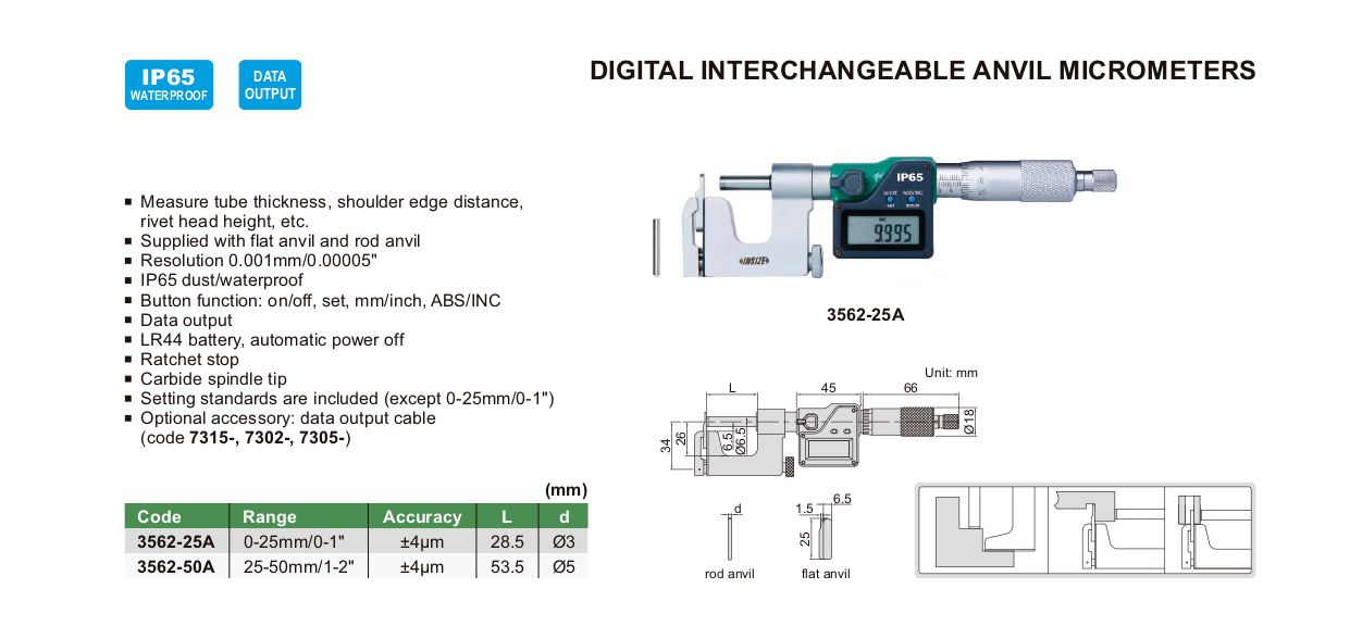 INSIZE 3562-25A Digital Interchangeable Anvil Micrometer (0-25mm/0-1") | EMIN.CO.TH
