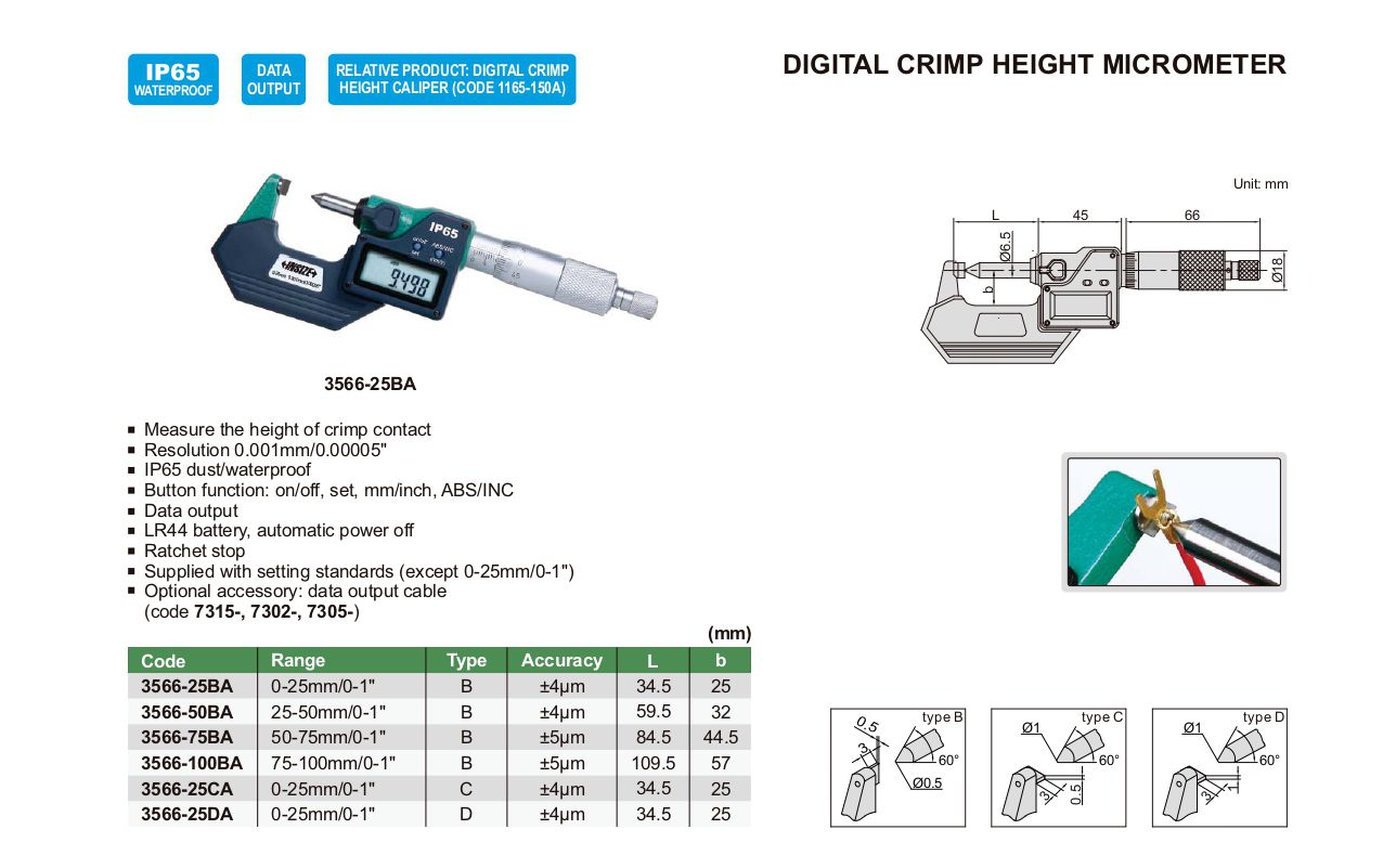INSIZE 3566-50BA Digital Crimp Height Micrometer (25-50mm/0-1") | EMIN.CO.TH