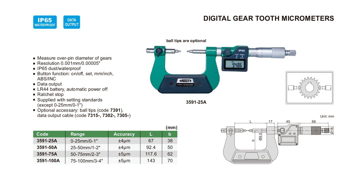 INSIZE 3591-25A Digital Gear Tooth Micrometer (0-25mm/0-1") | EMIN.CO.TH