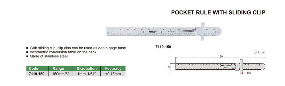 INSIZE 7119-150 Pocket Rule With Sliding Clip (150mm/6”; 1mm; 1/64”) | EMIN.CO.TH