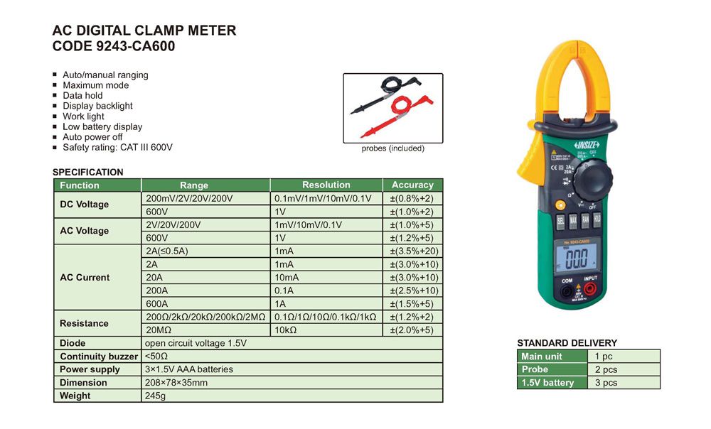 - Range: 600A; Resolution: 1A; Accuracy: ±(1.5%+5)