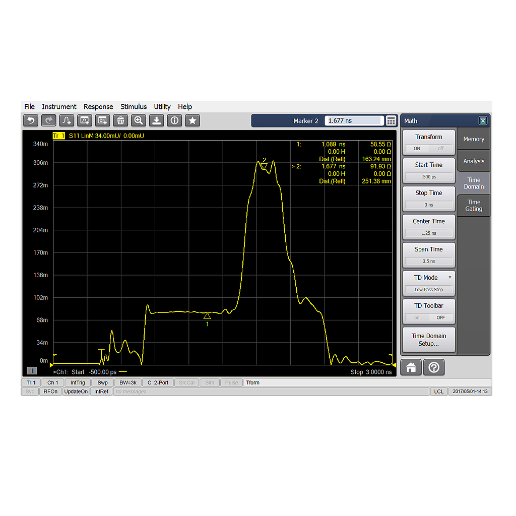 The time domain capability allows you to measure the time domain response of a device. The analyzer can transform frequency domain data to the time domain or time domain data to the frequency domain.