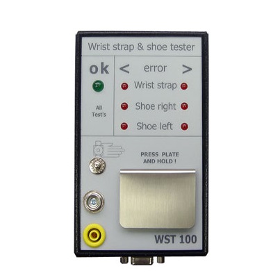 The WST100 provides a function test for electrostatic wrist straps and conductive footwear. Before you get access to ESD-secured areas the ESD precautions like wrist straps and conductive footwear should be tested on correct function.
