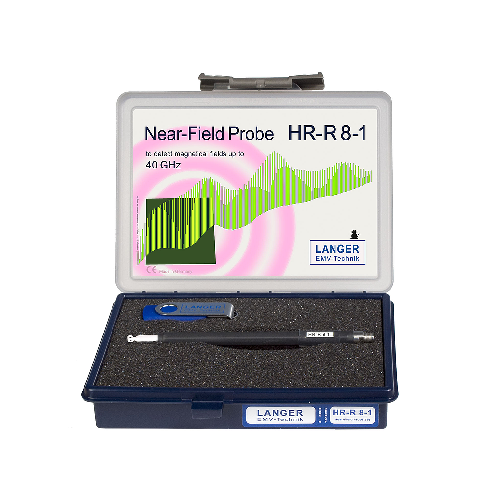 The HR-R 8-1 set contains the HR-R 8-1 B field probe. With this probe magnetic field measurements up to 40 GHz can be performed. The special probe head of the HR-R 8-1 allows measurements on IC’s, circuit board structures and components for the localization of high frequency magnetic fields.