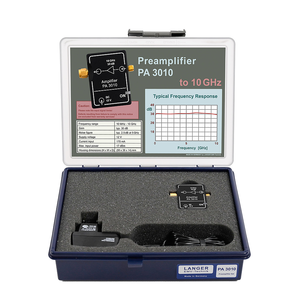 The PA 3010 preamplifier was designed for the amplification of measuring signals, e.g. weak signals of near-field probes with high resolution. The PA 3010 is to be used with the 50 ohm input of a spectrum analyzer or an oscilloscope and is powered by the plug-in power supply. With the correct cable a near-field probe can be connected to the input of the preamplifier. Input and output of the PA 3010 are SMA connectors.