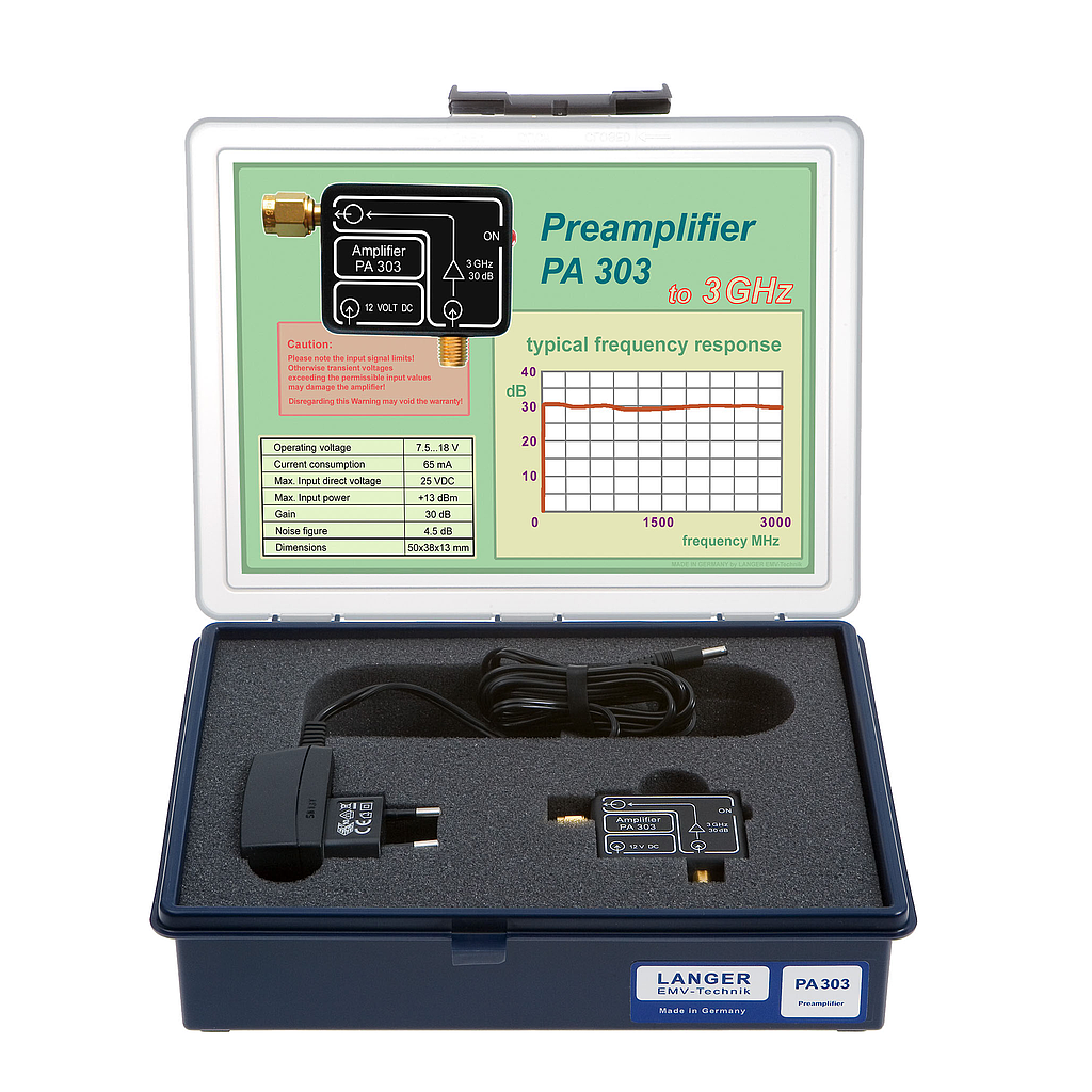 The PA 303 BNC preamplifier is designed for the amplification of measuring signals, e.g. weak signals of near-field probes with high resolution. The PA 303 is connected to the 50 ohm input of a spectrum analyzer or an oscilloscope and is powered by the wall-plug transformer. With the correct cable a near-field probe can be connected to the input of the preamplifier.