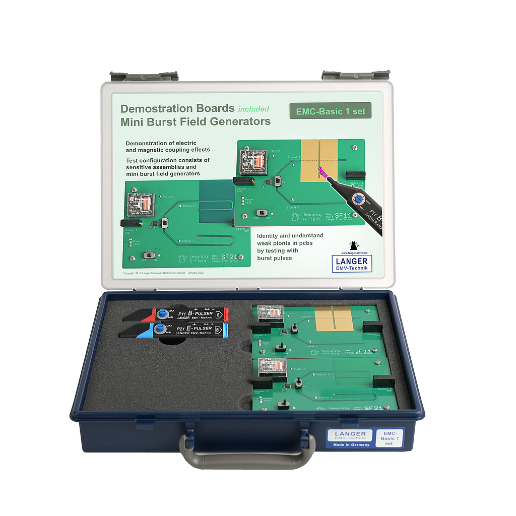 The boards are developed for demonstrations with ESD and burst generators of all manufacturers. With these demonstration boards, magnetic (SF 11) and electric (SF 21) coupling mechanisms of immunity can be clearly illustrated on one board each with the corresponding mini burst field generators (B-field: P11 pulser and E-field: P21 pulser).