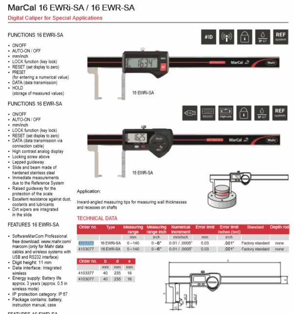 Mahr 4103377 Digital Caliper for Special Applications (16 EWRi-SA, 0-140mm) | EMIN.CO.TH
