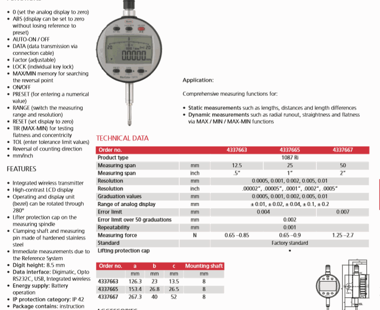 Resolution: 0.0005, 0.001, 0.002, 0.005, 0.01mm/.00002”, .00005”, .0001”, .0002”, .0005”