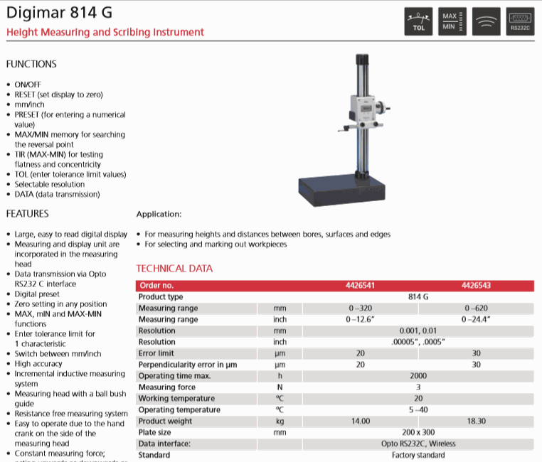 Package contains: height measuring instrument including operating and display unit, caliper arm 814t, spherical probe 814 m, 8 mm, battery, instruction manual, protection cover, test certificate