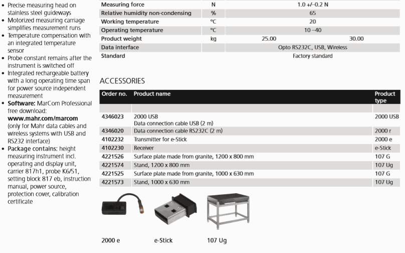 Package contains: height measuring instrument including operating and display unit, carrier 817h1, probe K6/51, setting block 817 eb, instruction manual, power source, USB cable, protection cover, calibration certificate