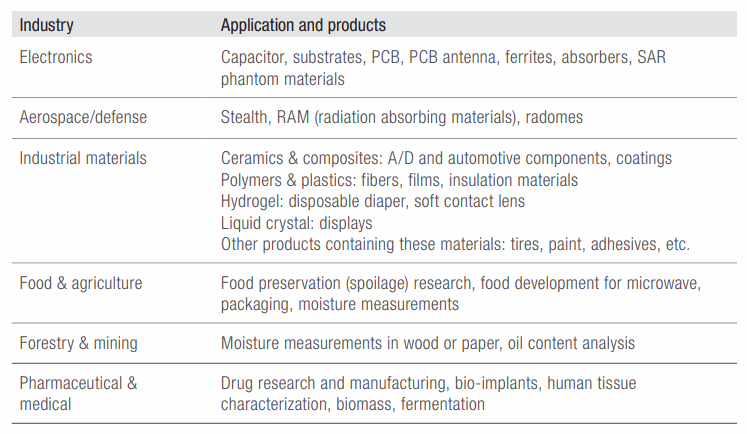 A wide variety of industries need a better understanding of the materials they are working with to shorten design cycles, process monitoring, and quality assurance. Every material has a unique set of electrical characteristics that are dependent on its dielectric properties. Accurate measurements of these properties can provide scientists and engineers with valuable information to properly incorporate the material into its intended application. A dielectric materials measurement can provide critical design parameter information for many electronics applications. For example, the loss of a cable insulator, the impedance of a substrate, or the frequency of a dielectric resonator can be related to its dielectric properties. More recent applications in the area of aerospace, automotive, food and medical industries have also been found to benefit from knowledge of dielectric properties.