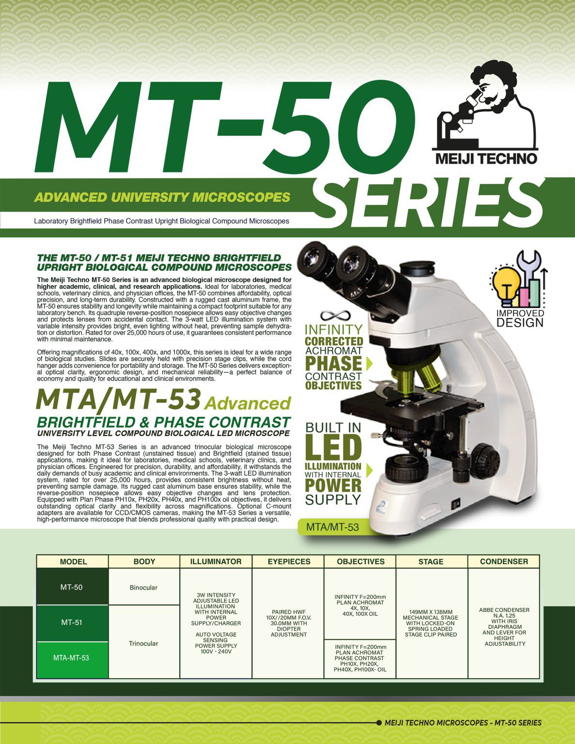 Siedentopf type design, trinocular 30° inclined tube on MT-50 Series, interpupillary distance adjustment 48-75mm, 360 degree rotatable.
