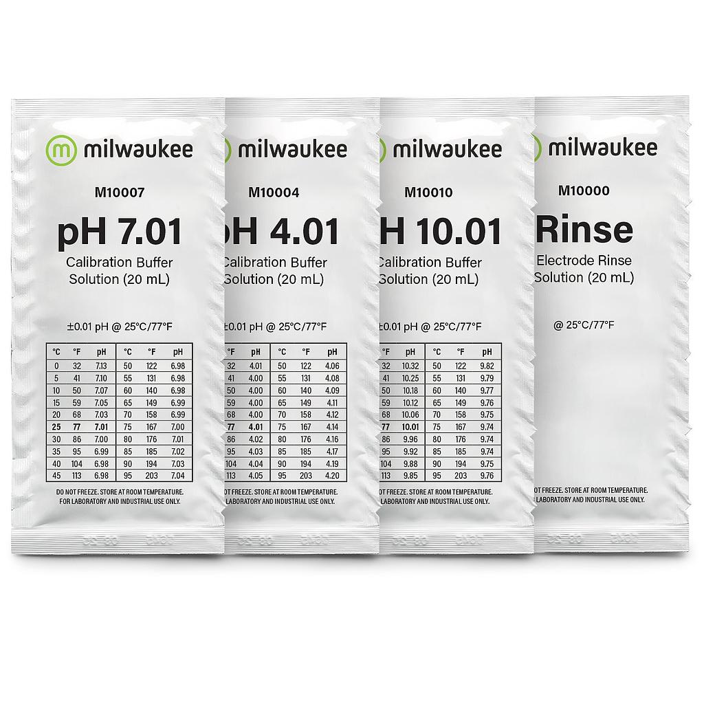 Included in the kit is lab grade pH 4.01 buffer solution sachets (M10004B), pH 7.01 buffer solution sachets (M10007B), pH 10.01 buffer solution sachets (M10010B) and electrode rinse solution sachets (M10000B). All sachets contain 20 mL of solution.