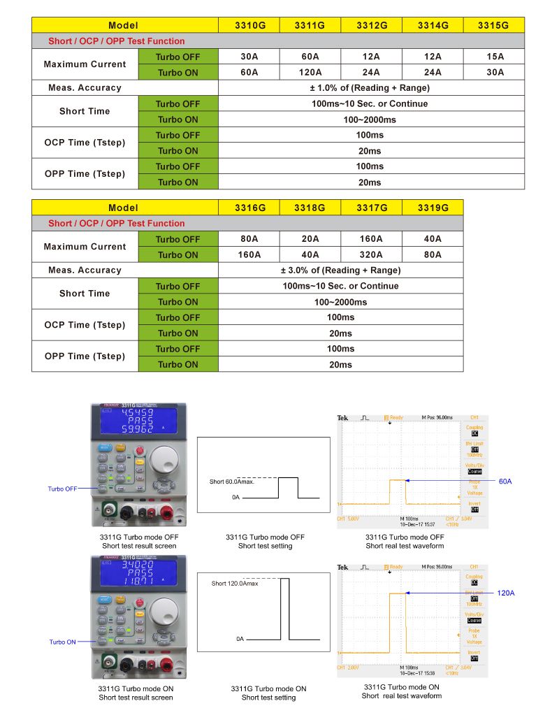 In addition to carrying over the outstanding performance of the 3310F series, the 3310G Series electronic Loads add a unique Turbo mode. This mode allows the load to support up to two times the rated current and power of a 3310F Series load for short periods of time.Turbo mode is very valuable for enhanced protection testing of power products. Examples include power supplies, Battery Management Systems (BMS) and protection devices such as Fuses / Breakers or PTC Resettable fuses. In doing so, the 3310G Series can test and verify the actual trip current levels and response times under abnormal operating conditions.