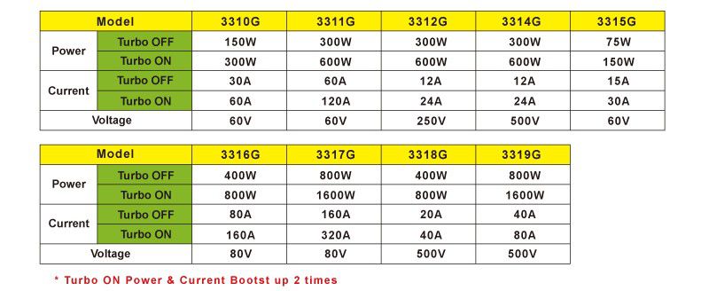 Model list of 3310G Series Electronic Load with Turbo mode.