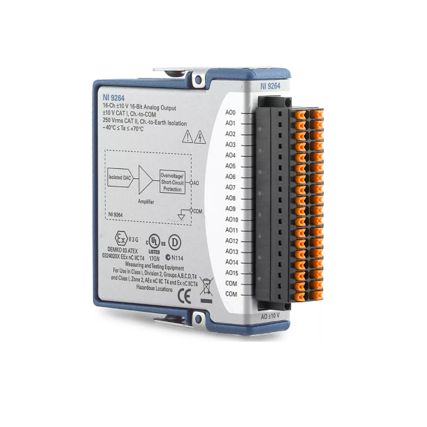The C Series Voltage Output Module helps you update analog output models that feature overvoltage protection, short-circuit protection, low crosstalk, fast slew rate, high relative accuracy, and NIST-traceable calibration. This module includes up to 16 channels. Some models include a channel-to-earth ground double isolation barrier for safety and noise immunity as well as improved signal quality, and some higher density models conserve chassis space, which leaves room for other measurement types.The C Series Voltage Output Module includes the NI-DAQmx driver and configuration utility that simplify configuration and measurements. NI-DAQmx supports NI programming environments as well as Python, ANSI C, C#.NET, and MathWorks MATLAB® software.